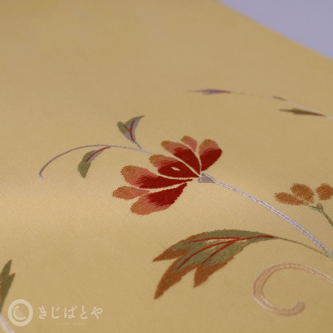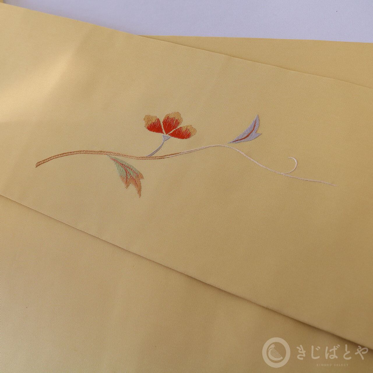 正絹塩瀬 たまご色に花の刺繍のなごや